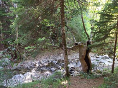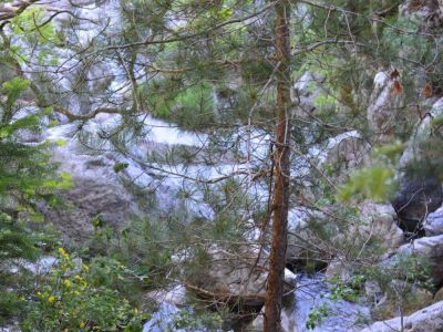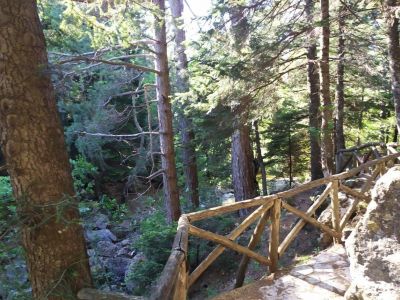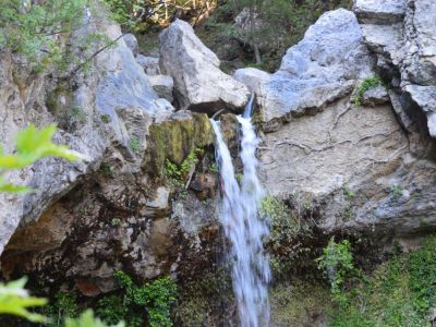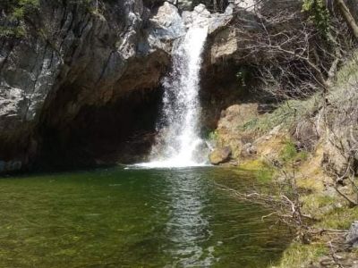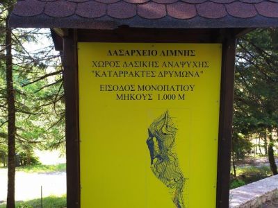 Λίγο πιο πάνω περιμένει το κιόσκι περιβαλλοντικής ενημέρωσης (για τις σχολικές επισκέψεις αλλά πιθανότατα κλειστό τις μέρες που δεν έρχονται μαθητές). Το νερό του καταρράκτη πέφτει από ύψος 15μ., σχηματίζοντας μικρή λίμνη κ’ η αγριάδα του ποικίλλει ανάλογα με την εποχή που θα τον επισκεφτείτε. Όσοι θέλετε περισσότερη απομόνωση μπορείτε ν’ ακολουθήσετε το σηματοδοτημένο μονοπάτι προς τα νότια, ανάμεσα στο δάσος της Ελάτης κ΄τη μαύρη πεύκη, που του οδηγεί σε πιο απόμερα σημεία του ρέματος.